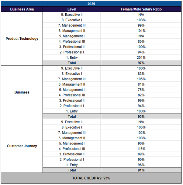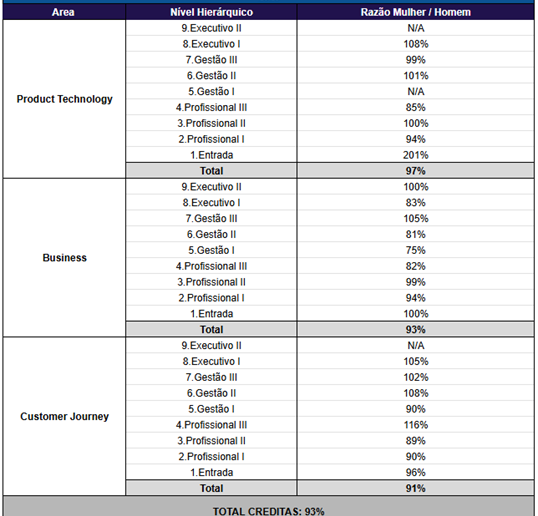 As of December 2025, women earned, on average, 93% of the median compensation of men at Creditas, maintaining the same level recorded in June 2025.