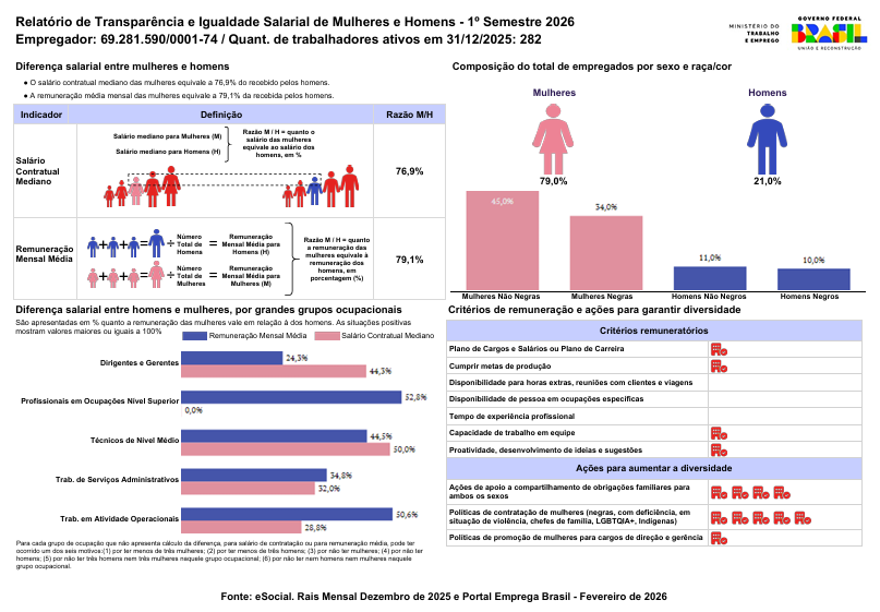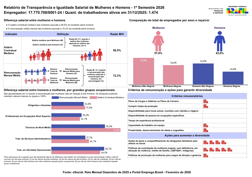 Em anexo, seguem os Relatórios de Transparência e Igualdade Salarial de Mulheres e Homens do Ministério do Trabalho e Emprego (MTE), referentes aos CNPJs ativos da Creditas em 2025. Os documentos foram elaborados a partir de dados da Relação Anual de Informações Sociais (RAIS) e segmentados segundo a Classificação Brasileira de Ocupações (CBO), considerando empresas com mais de 100 colaboradores, conforme os critérios do relatório.